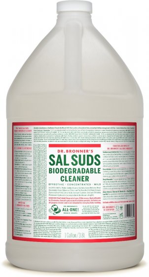 Dr. Bronner's Sal Suds Liquid Cleaner is not a soap but instead is a concentrated hard-surface all-purpose cleaner. It is made with plant-based surfactants and natural fir needle and spruce essential oils (no cheap, harsh pine stump oil), without any synthetic dyes, fragrances or preservatives. Perfect for general household cleaning (dishes, floors, laundry, etc.), it cleans and rinses with exceptional power, yet it is mild and gentle on the skin. Sal Suds Liquid Cleaner is equally effective in hard or soft water, rinsing freely, hot or cold. It is 100% cruelty-free, as certified by the Coalition for Consumer Information on Cosmetics, and it will biodegrade rapidly after doing its job.
